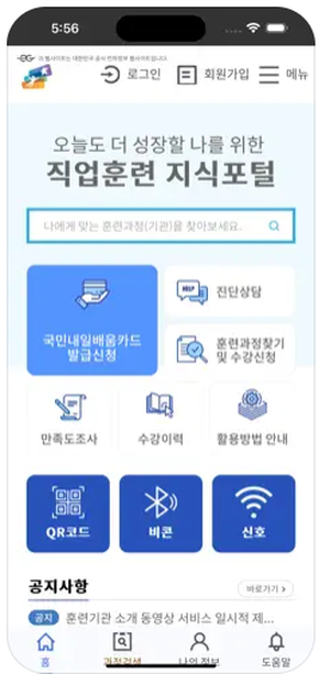 훈련과정, 훈련기관, 훈련비 등 고용노동부에서 지원하는 다양한 직업능력개발사업에 대한 정보제공 및 QR출결, 비콘출결 시스템 제공